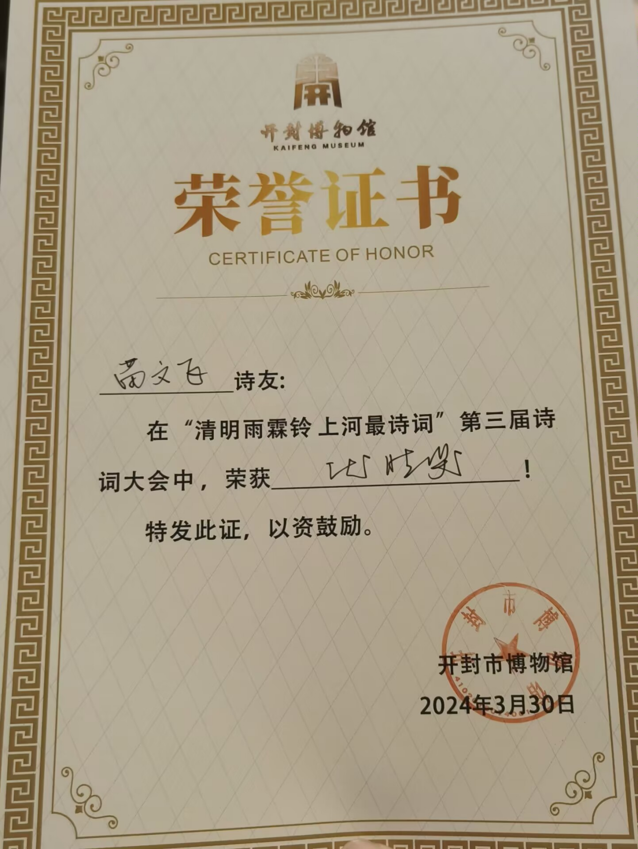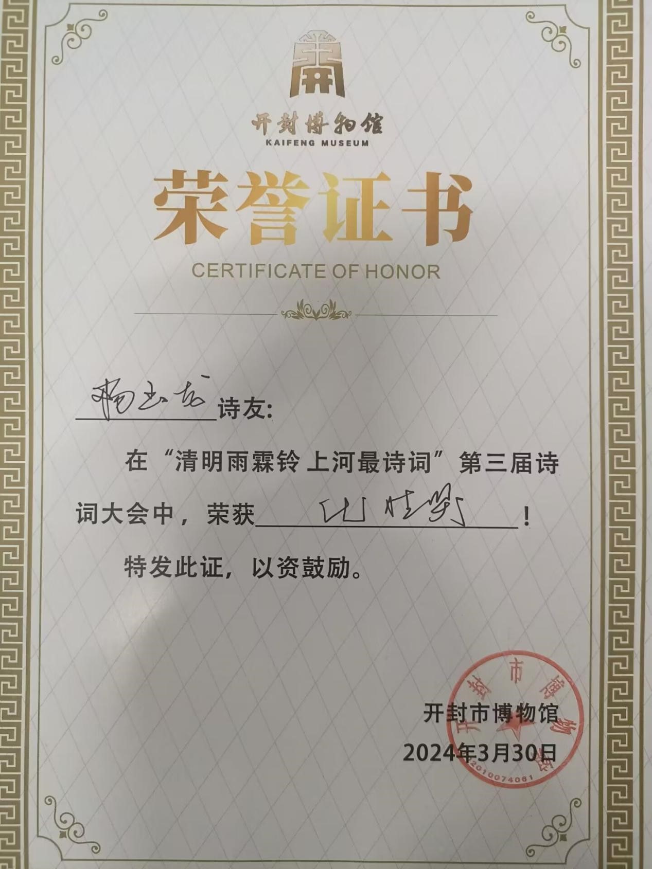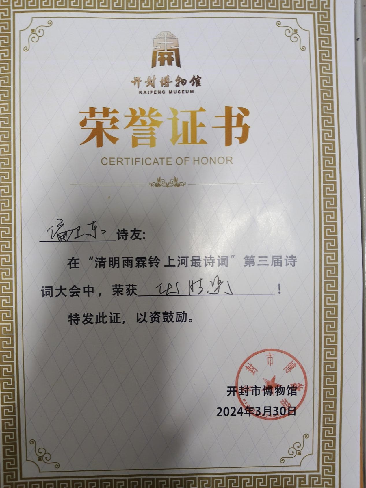 今天,我来到开封博物馆,内心充满了激动与喜悦。很荣幸能在开封博物馆举办的“第三届诗词大会”中获奖,这是我人生中一份特殊的、难忘的回忆。我们在比赛中互相学习、共同进步,这种氛围让我深受感动。在比赛中,我深入领略了诗词的韵味,感受到了中华文化的深厚底蕴。这次获奖是对我过去努力的肯定,也是对我未来学习的鞭策。我将珍惜这份荣誉,继续努力提升自己的诗词素养,为传承和弘扬中华文化贡献自己的力量。