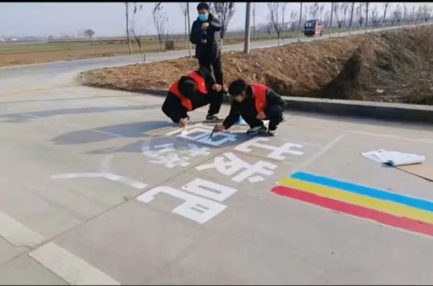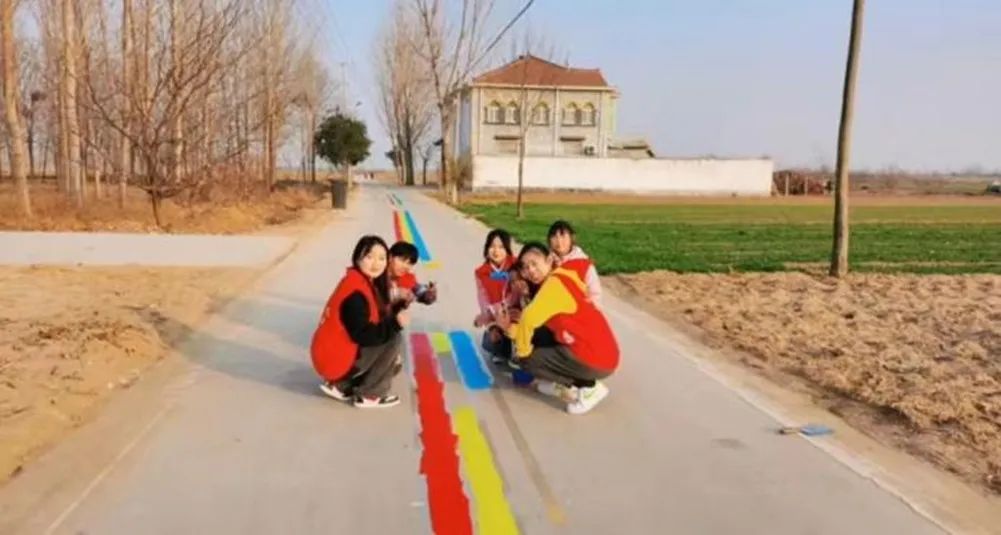 中加2201班的张良同学在鹤壁市淇县下曹村,积极参与道路规划,讨论环境美化方案,为社区的道路美化提供建议,协同志愿者们一同用彩绘装点街道。