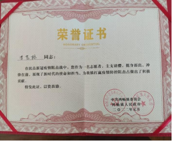焦梦迪,女,信息工程公司计算机2103班。志愿服务内容:疫情防控相关工作。在寒假期间,她所在的城市—安阳,疫情形势日趋严峻,安阳每个市、每个县、每个乡镇都展开了一天一次的核酸检测工作,她的主要工作是在村民进去做核酸之前提前负责帮他们测量体温,维持现场秩序等。她表示:作为一名老员工我有义务积极参与防控疫情当中去。