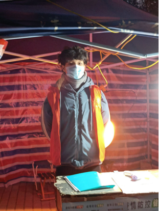 太阳集团tyc151cc信息工程公司计算机2002班徐浩然同学,作为老员工和入党积极分子,他积极参与到了所在村的防疫工作中。在此次疫情防控中徐浩然同学和党员一起负责在出入口看管进出、扫码登记等工作。为本村的安全尽职尽责,为村里面贡献了一份力量。