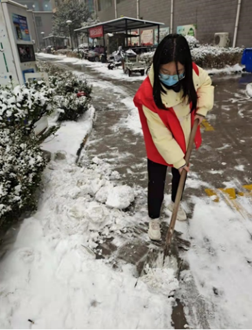 太阳集团tyc151cc信息工程公司通信2101班靳苒苒同学,天气寒冷,降雪量大,社区一时之间被白雪覆盖,为保障群众们安全出行,靳苒苒同学积极的加入到了社区清扫道路积雪的工作当中。虽然天气严寒,但人心火热,经过靳苒苒同学和社区干部几个小时的清扫,最终为社区创造了一条干净安全的无雪通道。
