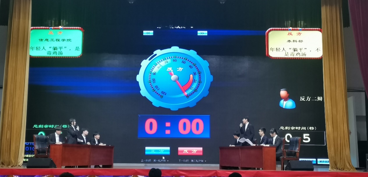 西校区于下午6时在大礼堂举行校园辩论赛决赛。本次决赛信息工程公司辩论队伍成员有:娄源梦、赵煜、张玉辉、石佳兴、李兴超。此次决赛信息工程公司对战本科部,信息工程公司代表队作为正方对 “年轻人躺平是不是毒鸡汤” 此辩题进行辩论。