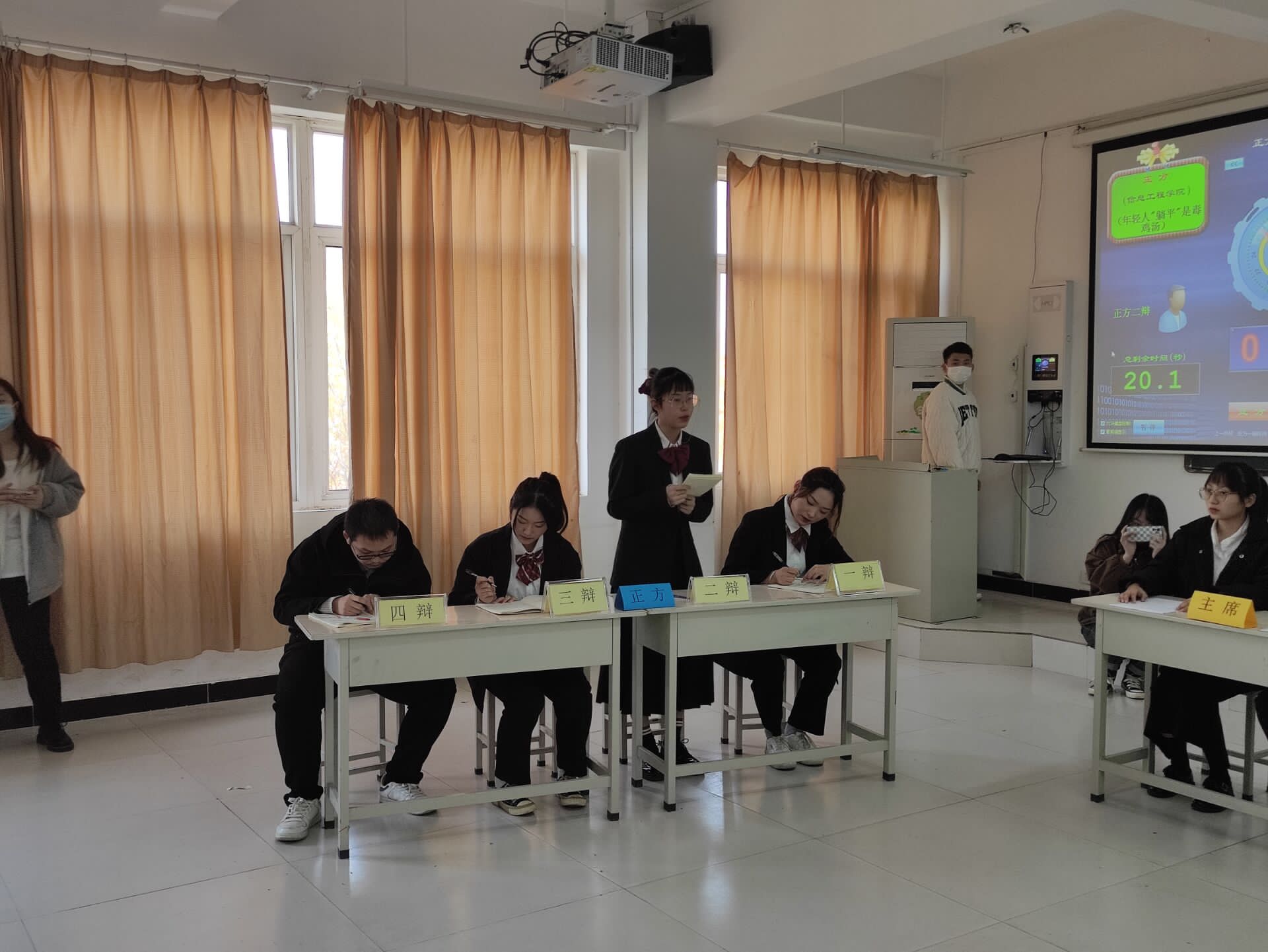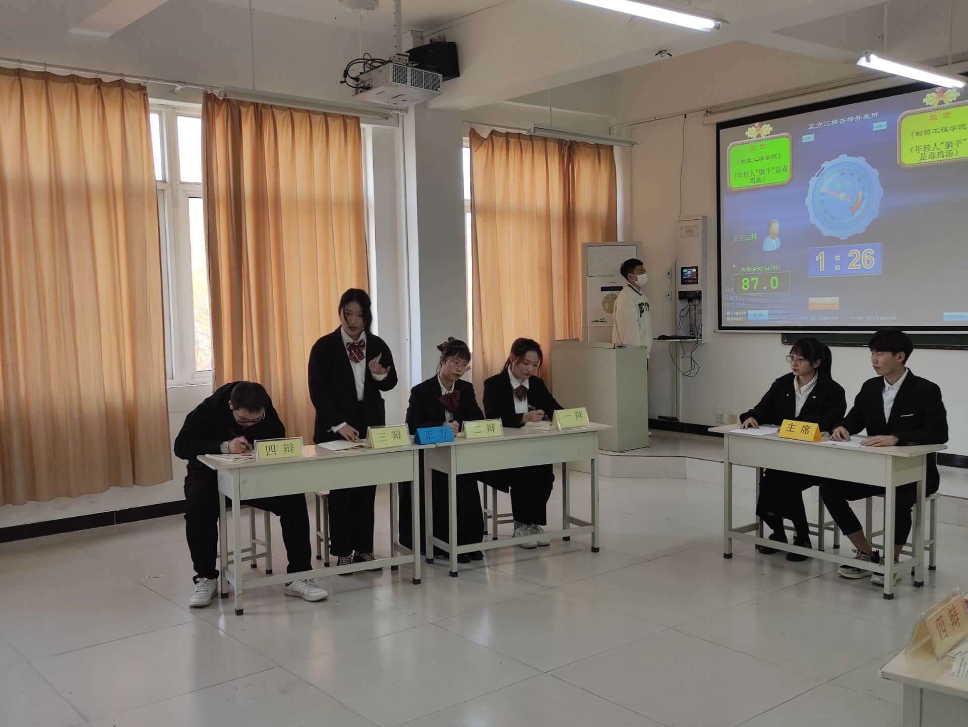 东校区辩论赛代表队于当日中午12点半在教学楼203教室与制药工程公司进行此次辩论赛决赛的比拼。本次辩论赛的主题是“年轻人躺平是不是毒鸡汤”,正方代表是来自信息工程公司的靖婉秋,余启航,许锋云,裴俊骁