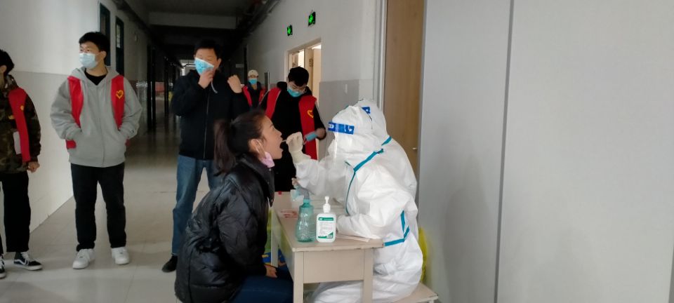 在核酸检测准备阶段,志愿者们帮忙拉好警戒线、分发防疫物资、做好消菌杀毒等工作,一切准备就绪后通知各班级按照学号到现场排队做核酸检测。