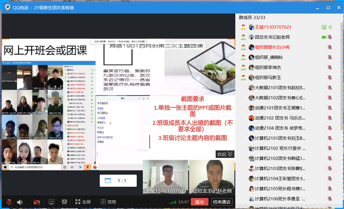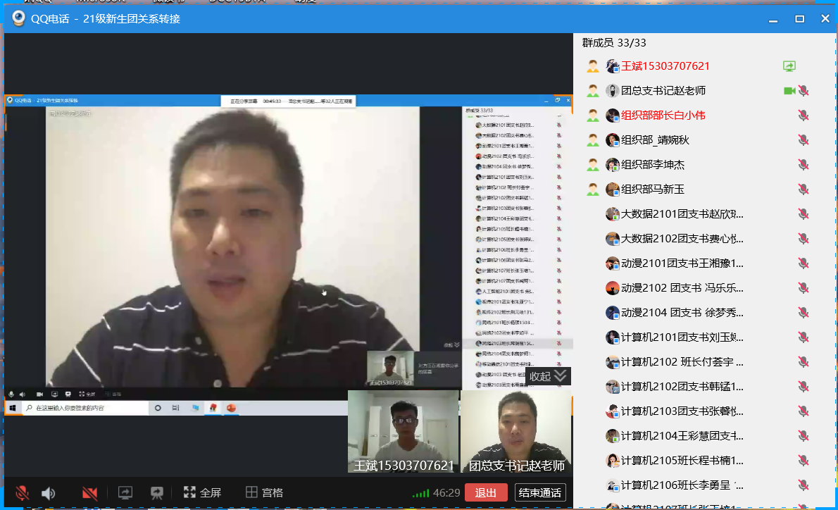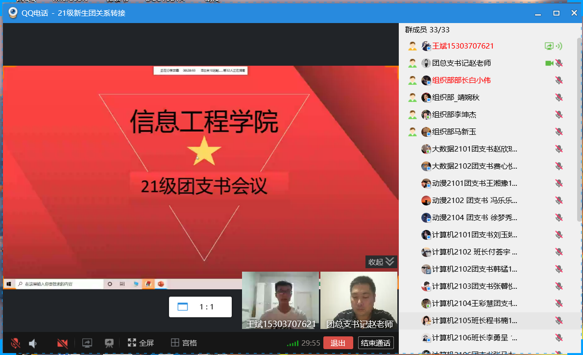 为了加强各班团支部负责人对其工作的认识,熟悉团组织各项工作的内容,为今后团组织各项活动的开展提前做好准备,信息工程公司团委组织部于2021年9月17日以线上会议的形式顺利召开了2021-2022学年第一次团支部负责人大会。信息工程公司团总支书记赵源,员工会组织部工作人员以及全体21级团支部负责人参与此次会议。