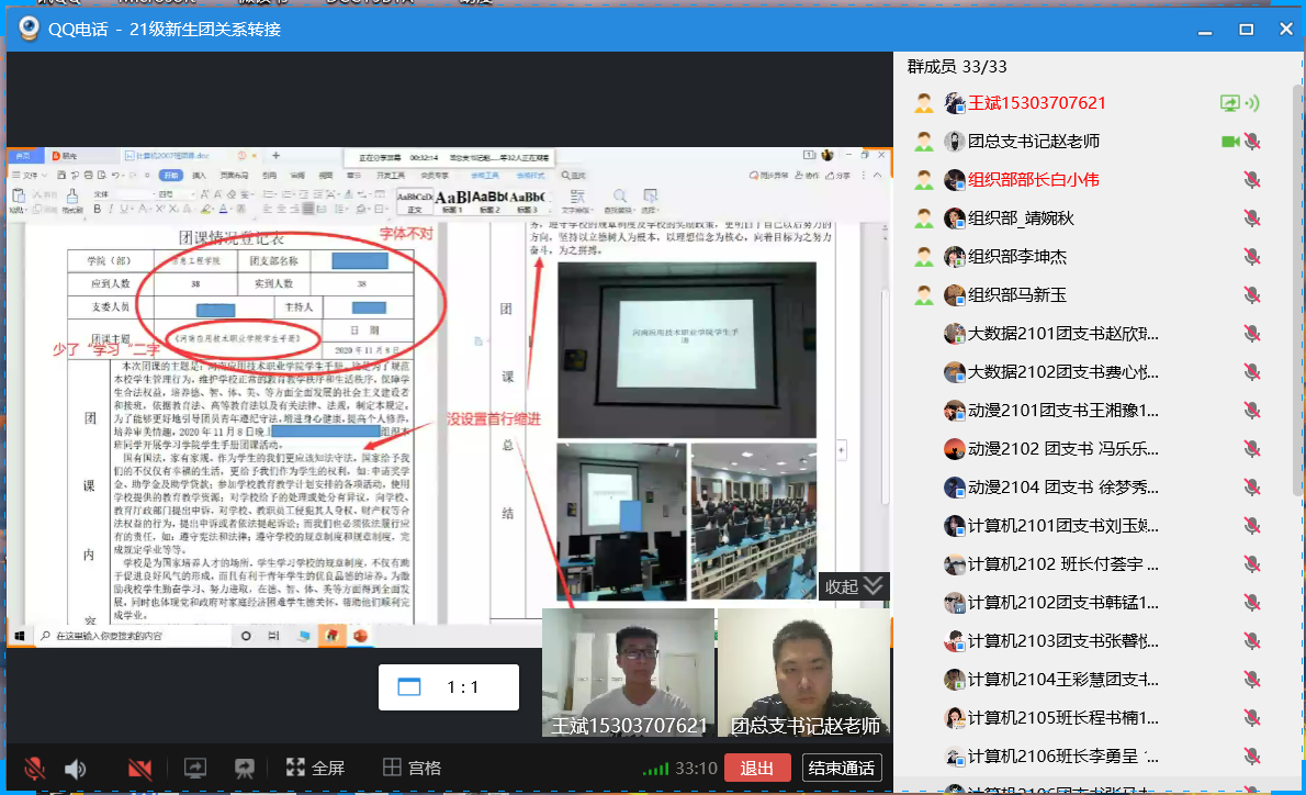 随后组织部王斌同学给各位21级团支部负责人讲解了团课记录的要求,并强调各班负责人注意模板格式要求,并向各班团支书告知了九月份第一次工作内容——开展“请党放心,强国有我”主题团课。随之,组织部就智慧团建审批、团课上传格式、团日活动要求等几个方面对团支部负责人进行讲解。最后,组织部部长白小伟为21级各班不懂的问题答疑解惑。