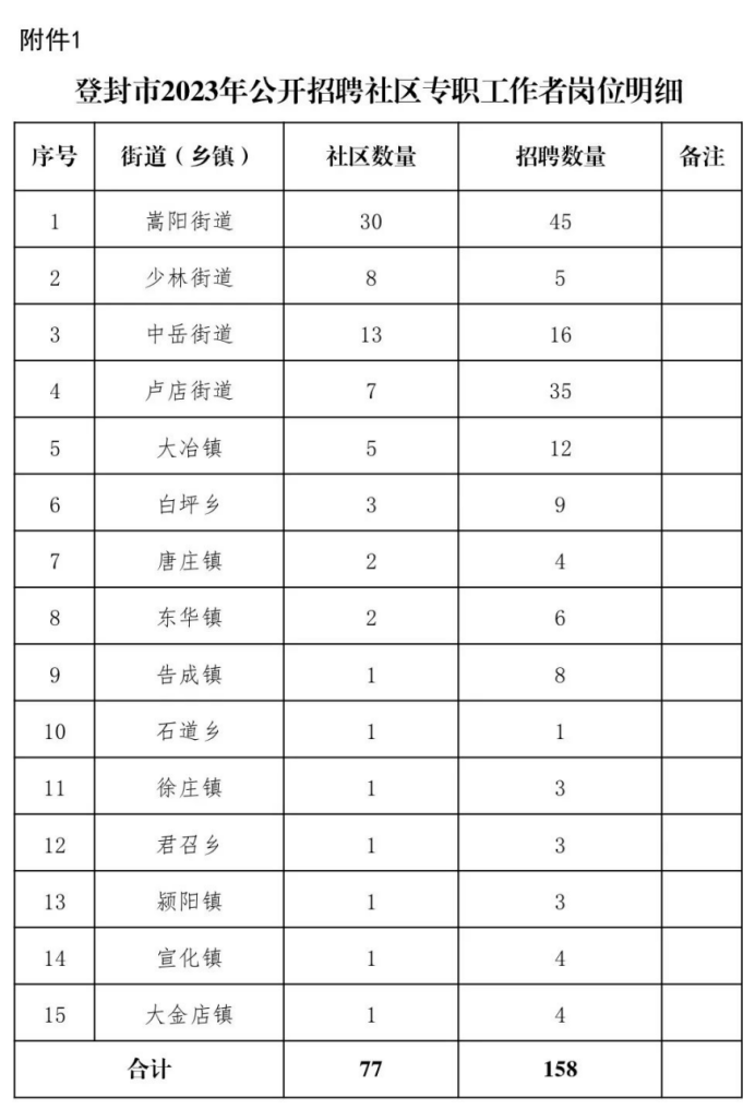 本次计划为全市15个乡(镇)、街道公开招聘158名社区专职工作者,其中01岗位面向登封市国有企业下岗职工招聘10人,02岗位面向社会公开招聘148人。(具体岗位明细见附件1)