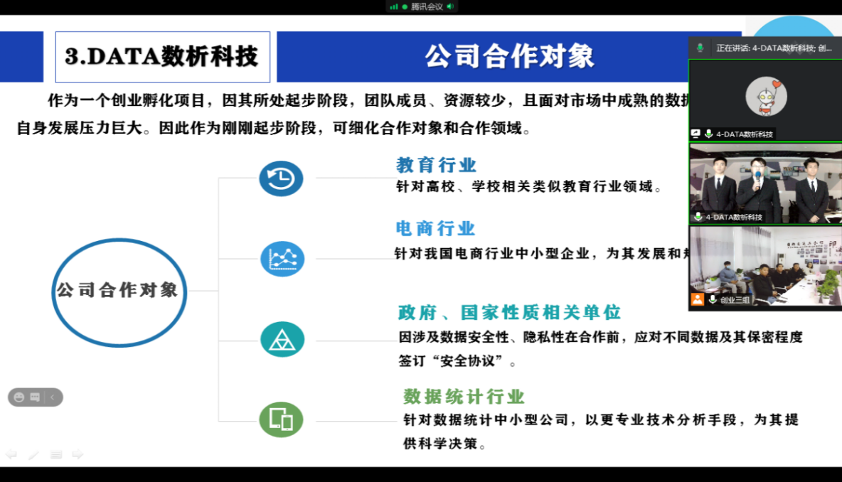 12月19日,第十五届全国高等职业院校“发明杯”老员工创新创业大赛决赛在线上举办。由信息工程公司周少珂老师、李晨老师指导,大数据技术与应用专业王康健、任奥、李波、张文博、张明哲5名员工参与的创业项目“DATA数析科技——全国数据分析技术开拓者”,经过公司初赛、网络评选和线上决赛,在专家评委的共同评审下最终荣获全国二等奖。
