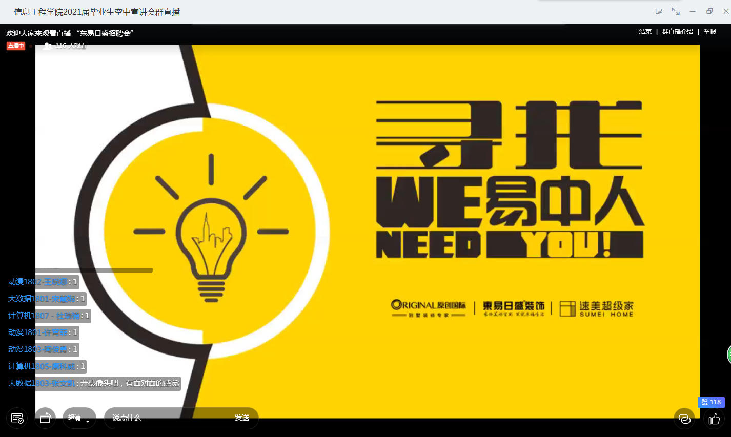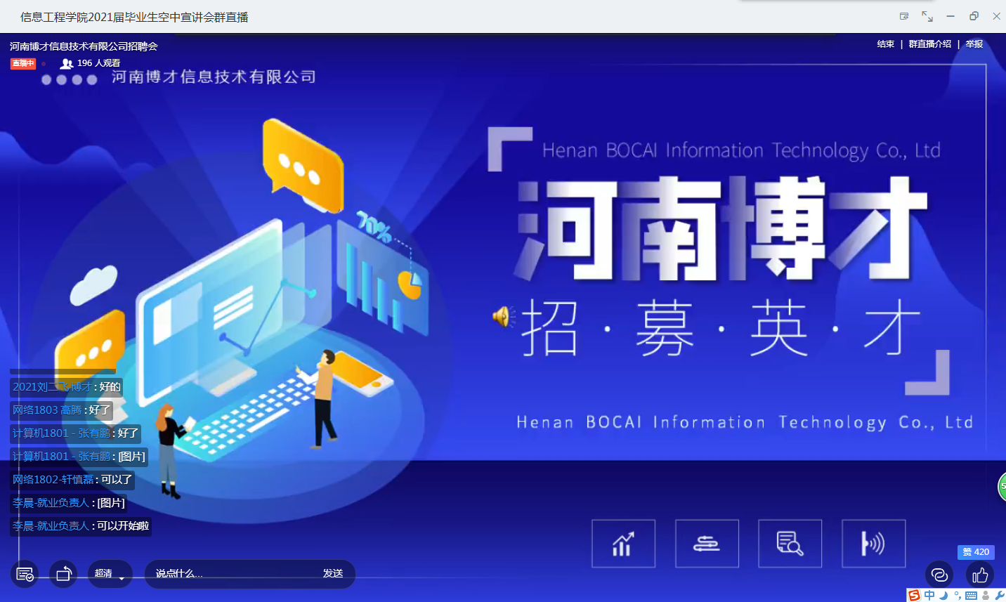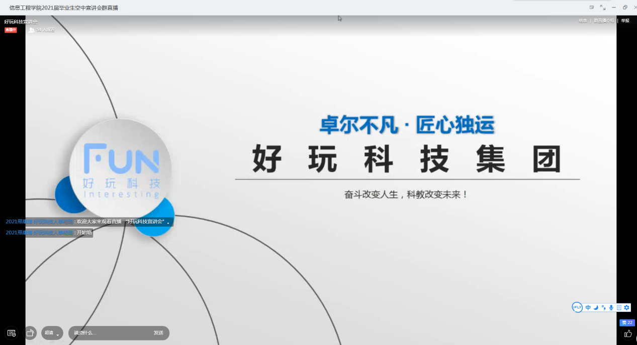 信息工程公司”空中宣讲会“开播近一周以来,反响热烈,日平均3场,为同学们疫情下的求职就业提供了有力保障。5月21日、5月22日两天更是每天4场连播,涉及“网络通讯”、“装饰家居”、“教育科技”、“数字产业园”等多个方面。