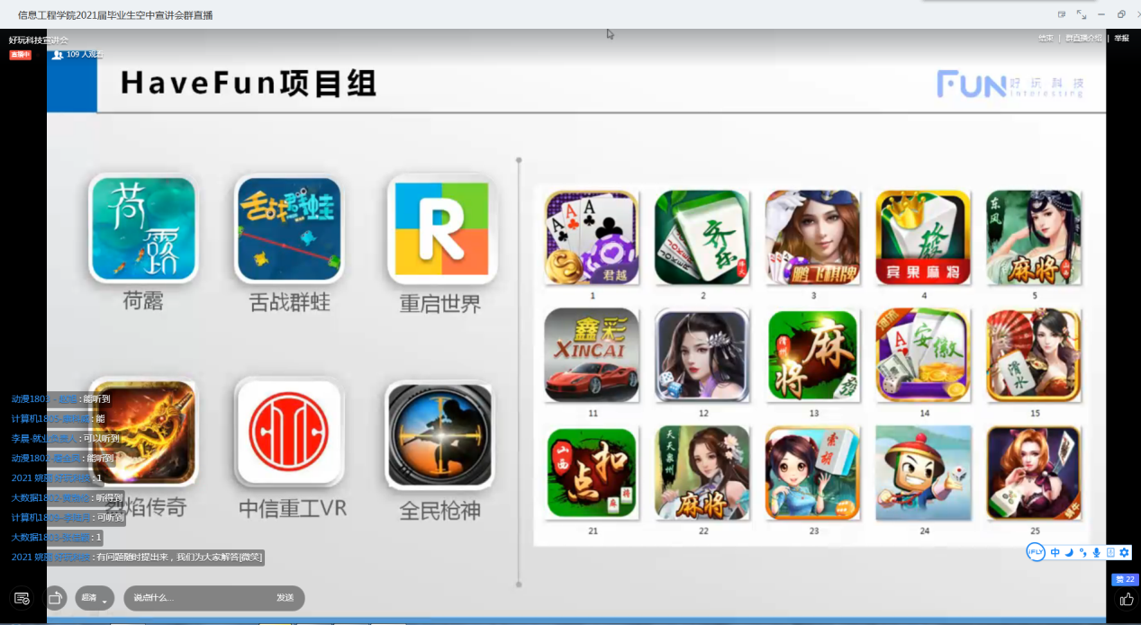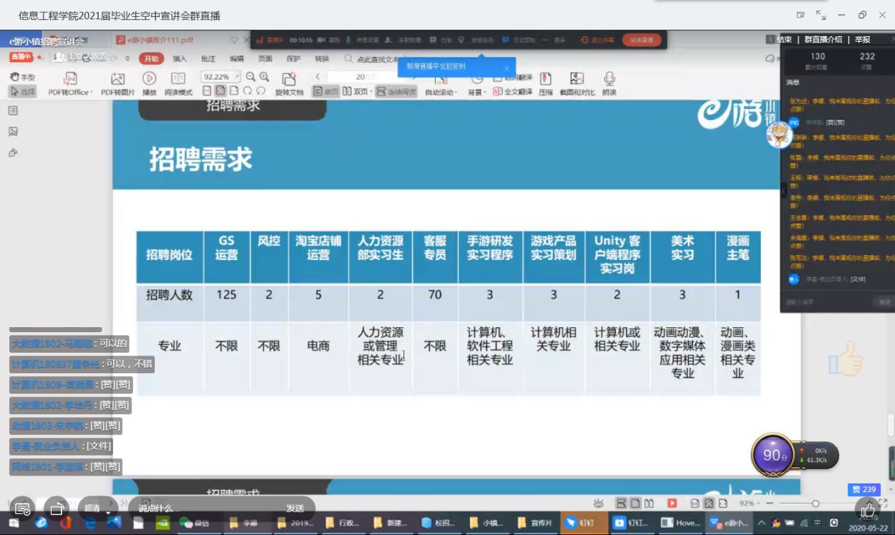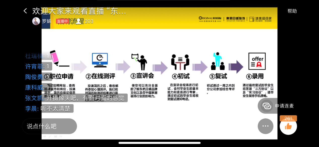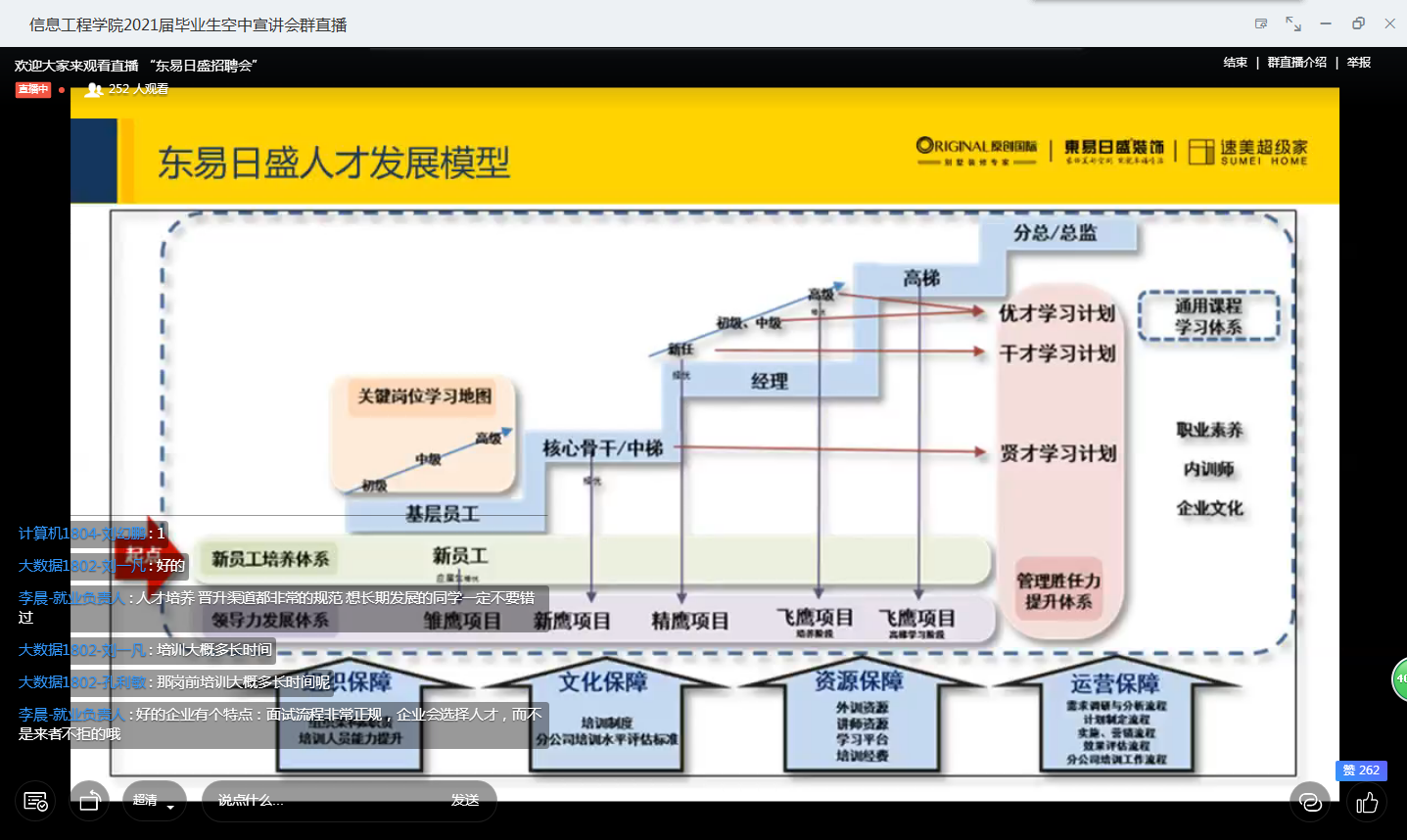 信息工程公司”空中宣讲会“开播近一周以来,反响热烈,日平均3场,为同学们疫情下的求职就业提供了有力保障。5月21日、5月22日两天更是每天4场连播,涉及“网络通讯”、“装饰家居”、“教育科技”、“数字产业园”等多个方面。