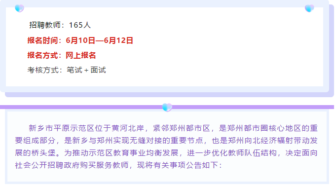 本次共招聘中小学教师165名。具体招聘计划及要求见《平原示范区2020年公开招聘教师计划一览表》(附件)。