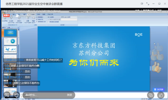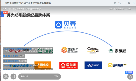 自信息工程公司推出”空中双选会“以来,全院2018级员工积极参与,累计投递简历近1500份。为了丰富”空中双选会“形式,给广大同学提供更广阔的平台,公司继续推出”空中宣讲会“。2020年5月15日晚,河南贝壳信息技术有限公司河南总部校园招聘部招聘经理李经理,京东方杰恩特喜科技有限公司招聘经理裴经理应邀为同学们开启首场”空中双选会,公司2018级700余名员工通过钉钉直播参与其中。